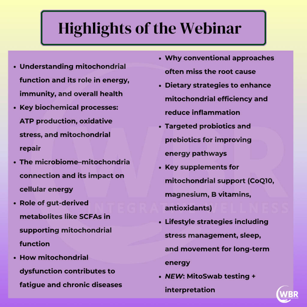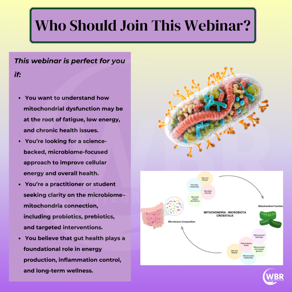 In this webinar, discover how the microbiome–mitochondria connection influences energy production, inflammation, and chronic disease—and how a functional medicine approach can help you restore cellular health from the inside out.