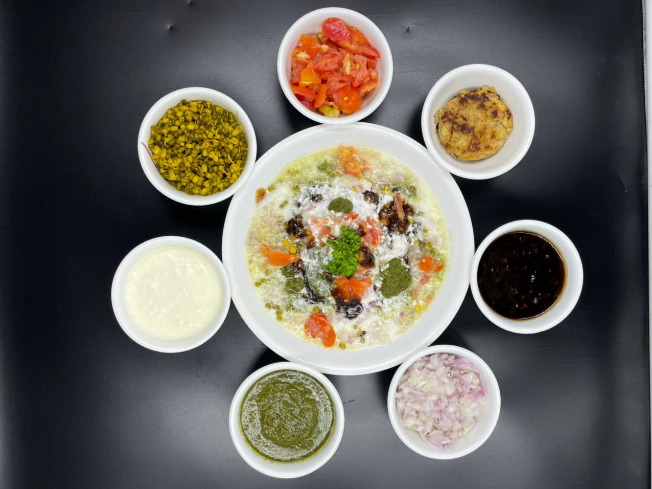 - Add sprouted moong (mung beans), onion, tomato, curd, green and sweet chutney according to your taste.